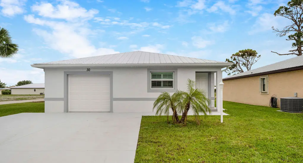 Brand-new concrete construction with impact-resistant windows and a metal roof